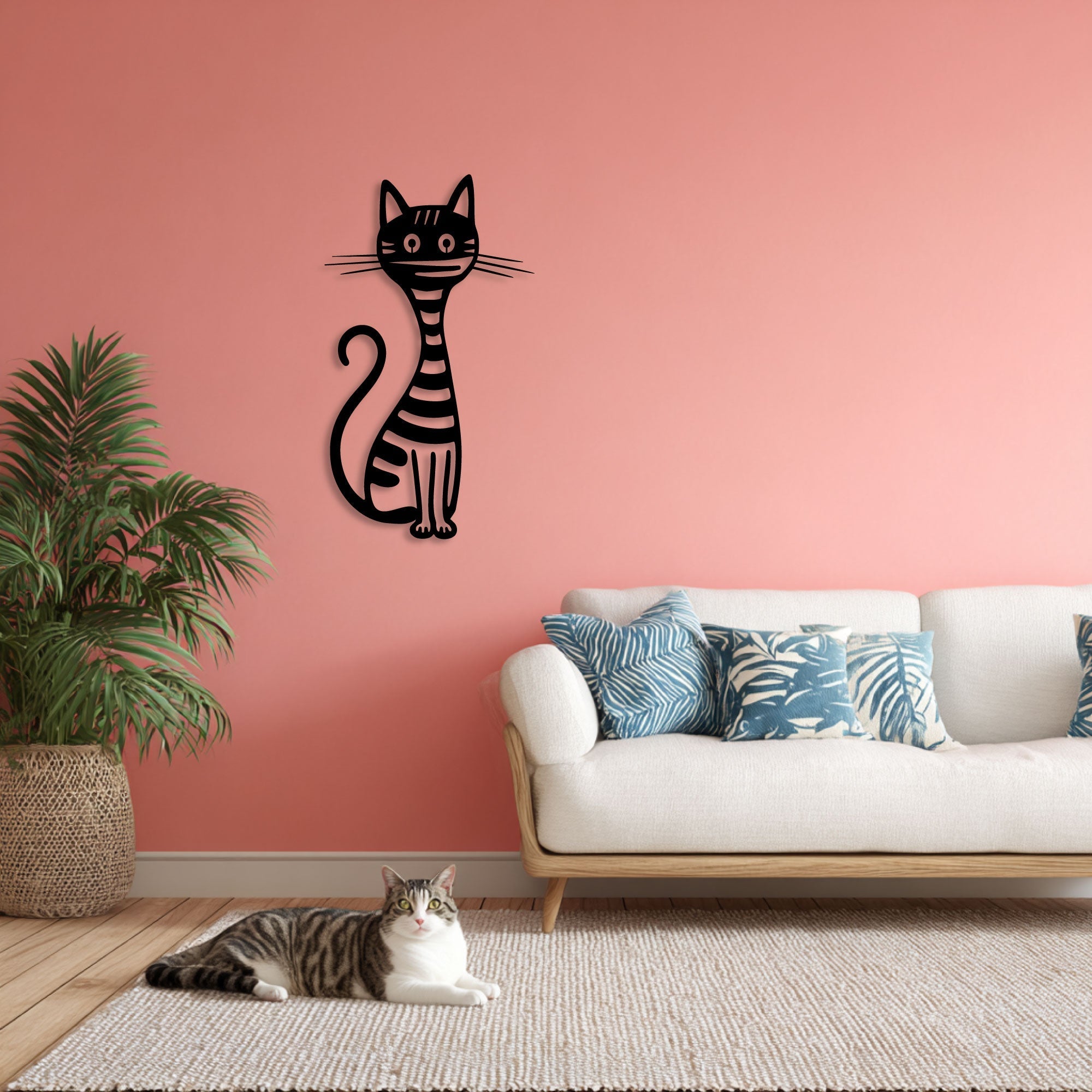 Met zijn gestreepte lichaam, grote ronde ogen en krullende staart voegt deze decoratie niet alleen karakter toe aan uw muren, maar ook een vleugje humor en vreugde. Ideaal voor elke ruimte, van de woonkamer tot de kinderkamer, deze wanddecoratie transformeert uw interieur en maakt het een uitnodigende plek om te ontspannen en te genieten. Voor kattenliefhebbers is dit een must-have item dat niet alleen de liefde voor katten weerspiegelt, maar ook een levendige en vrolijke sfeer creëert. Voeg een persoonlijk tintje toe aan uw woning of verras iemand met een bijzonder cadeau dat blijvende indruk maakt.