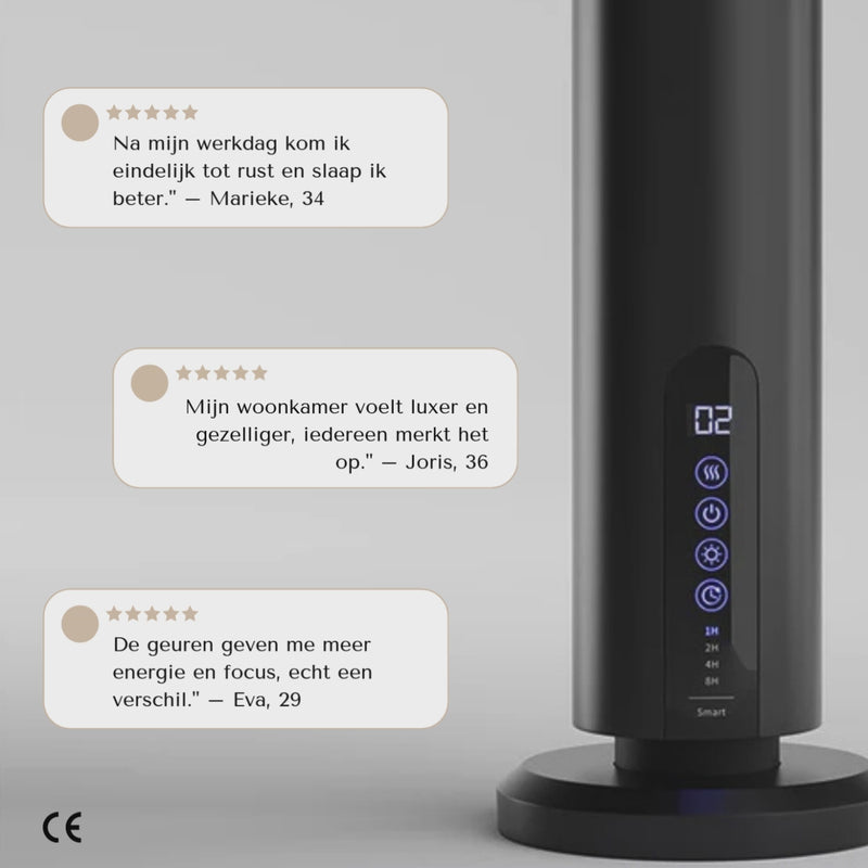 Begin met het aansluiten van je diffuser, verbind hem via Bluetooth met de app en voeg je favoriete geur toe — in enkele minuten is alles klaar en verandert je huis direct in een rustgevende, luxe omgeving.”