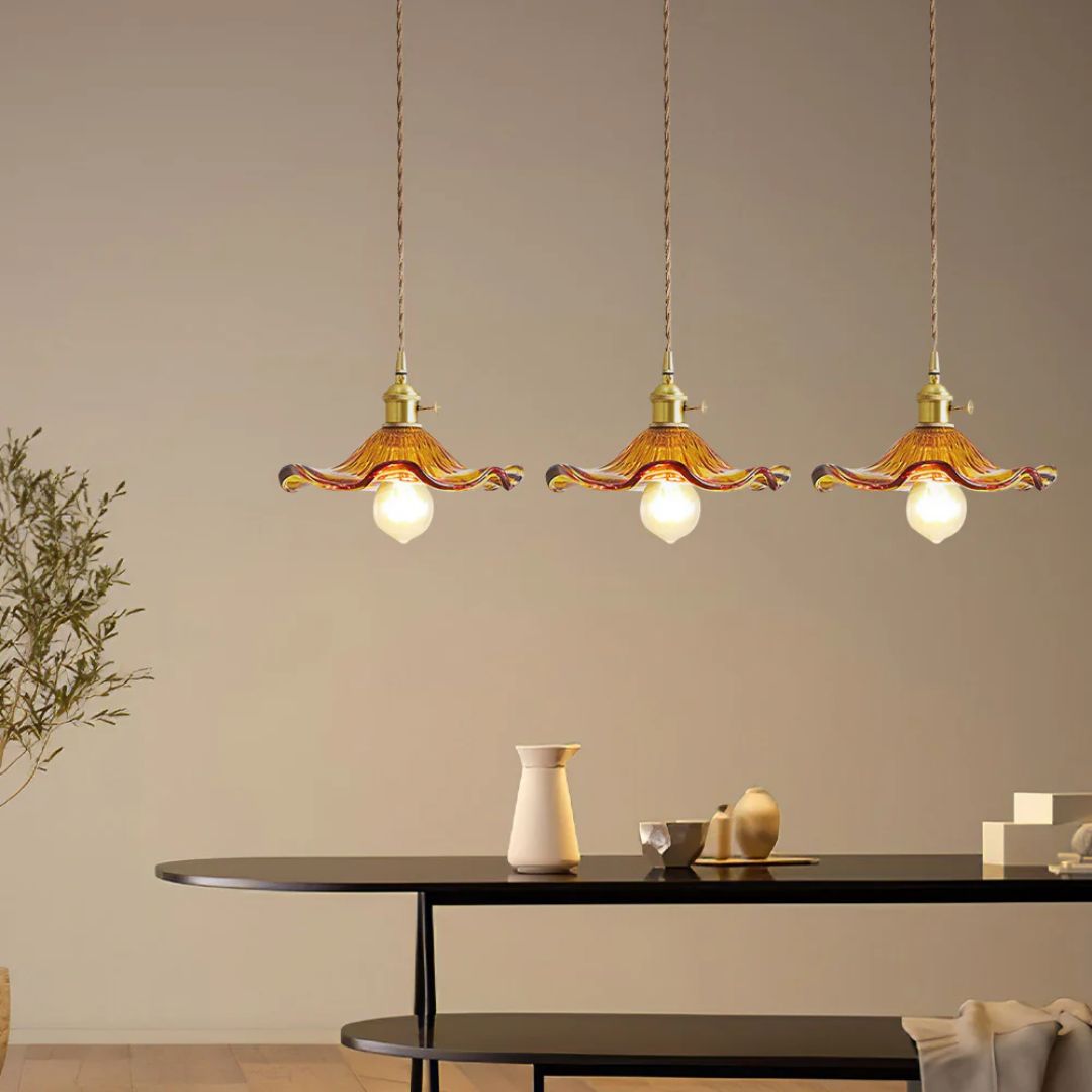 Met haar elegante uitstraling en speelse golvende randen van groen glas, brengt deze lamp een organische charme in iedere ruimte. De warme messing fitting voegt een klassiek accent toe, waardoor deze hanglamp perfect is voor boven een nachtkastje, in een gezellige leeshoek of als eye-catcher boven de eettafel. De Cleo flower hanglamp verspreidt het licht op een zachte manier, waardoor een uitnodigende sfeer ontstaat die uitnodigt tot ontspanning en samenzijn. Met haar compacte afmetingen is ze ideaal voor zowel kleine als grote ruimtes, en de zichtbare lichtbron maakt het een decoratieve keuze met een retro flair.