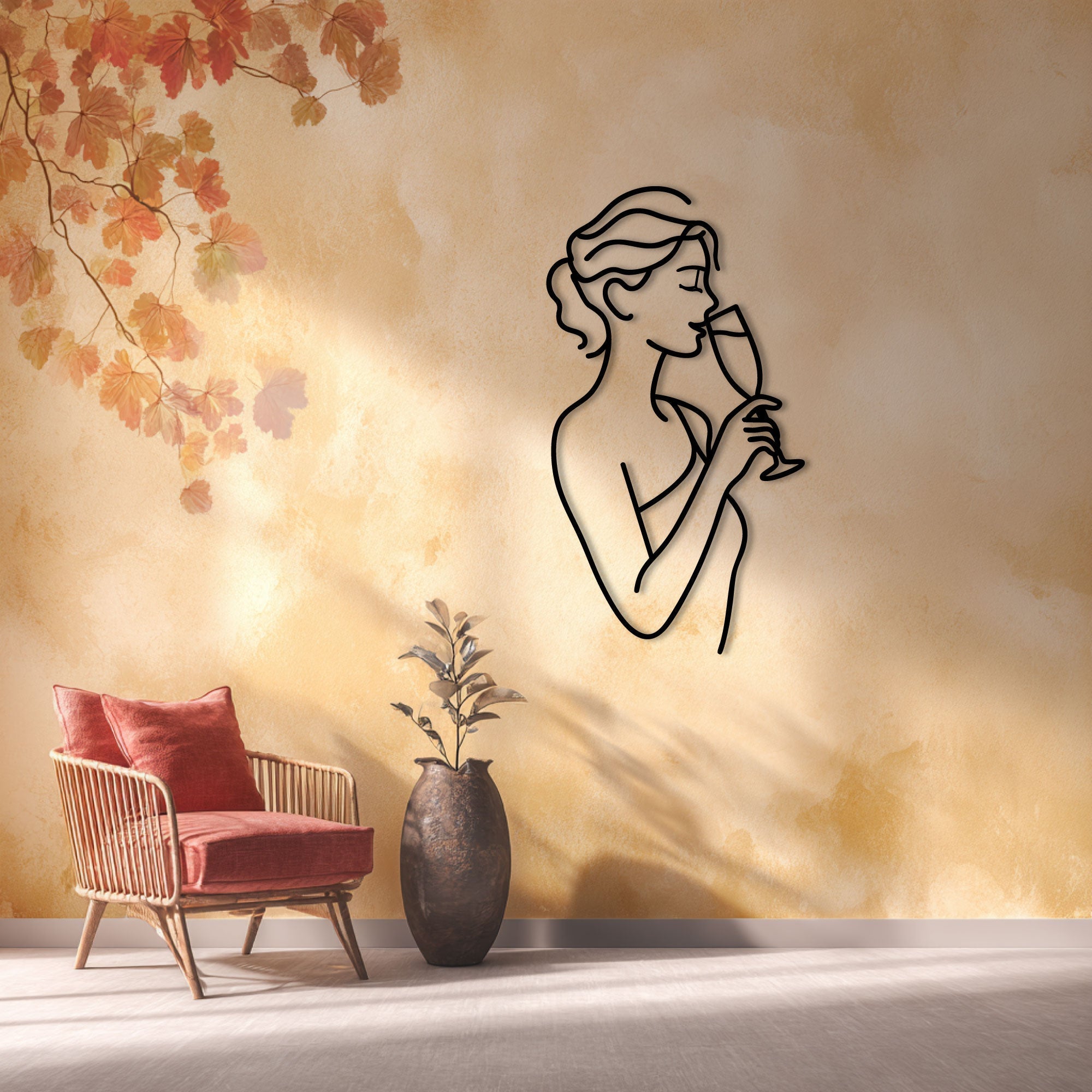 Deze prachtige decoratie, die een gracieuze vrouw met een champagneglas in minimalistische line art toont, is ontworpen om een verfijnde sfeer te creëren in elke ruimte. Gemaakt van duurzaam metaal, blijft ze jarenlang mooi en past ze perfect in hedendaagse interieurs. Of u nu uw woonkamer, eetkamer of kantoor wilt verfraaien, deze wanddecoratie tilt de uitstraling van uw omgeving naar een hoger niveau. Het strakke ontwerp maakt het niet alleen een visueel hoogtepunt, maar ook een origineel cadeau voor kunst- en designliefhebbers. Geef een symbool van elegantie en viering cadeau en voeg artistieke waarde toe aan elk interieur.